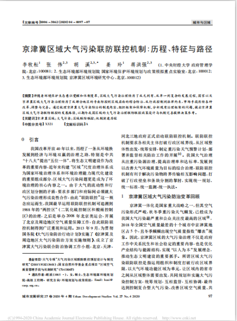 近日,beat365官网研究生李牧耘在《城市发展研究》2020年第4期发表学术论文,题目为《京津冀区域大气污染联防联控机制:历程、特征与路径》。