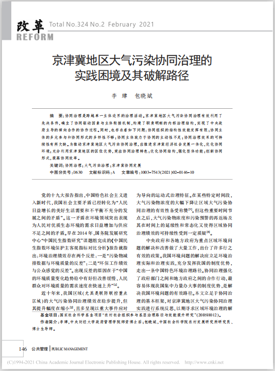 近日,beat365官网李珒博士在《改革》2021年2期发表学术论文,题目为《京津冀地区大气污染协同治理的实践困境及其破解路径》。