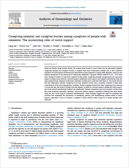 近日,beat365官网公共事业管理系刘一伟博士以通讯作者在Archives of Gerontology and Geriatrics发表学术论文,题目为Caregiving intensity and caregiver burden among caregivers of people with dementia: The moderating roles of social support.