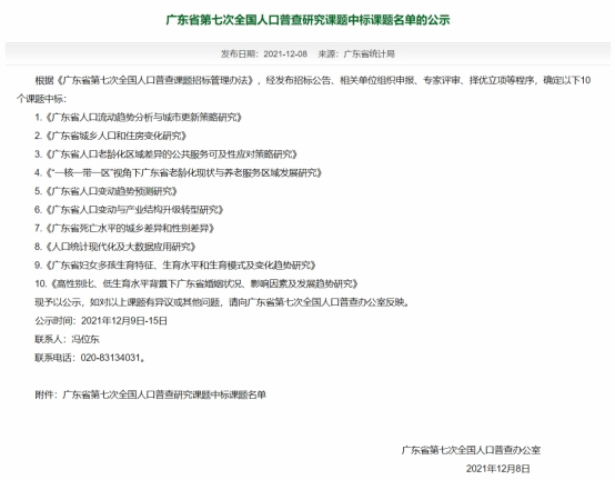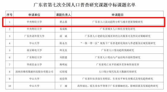 2021年12月8日,广东省第七次全国人口普查办公室发布了《广东省第七次人口普查研究课题中标课题名单的公示》文件。beat365官网黄志基副教授团队申报的课题《广东省人口流动趋势分析与城市更新策略研究》经过专家评审、择优立项等程序,最终顺利中标。此次课题中标是beat365官网落实产学研融合、服务国家和地方重大需求的新突破,为beat365官网在广东省人口治理、城市更新等领域的研究夯实基础。