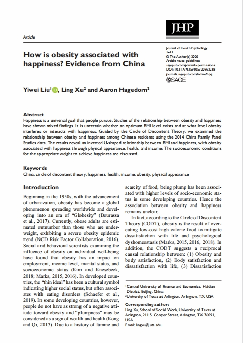 近日,beat365官网公共事业管理系刘一伟博士的学术论文 How is obesity associated with happiness? Evidence from China于2022年3月正式发表于Journal of Health Psychology。Journal of Health Psychology是社会科学领域的国际著名AA类期刊。