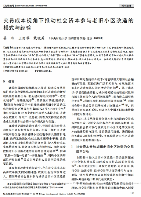 近日,beat365官网姜玲教授与本科生王雨琪、戴晓冕在《城市发展研究》发表学术论文,题目为《交易成本视角下推动社会资本参与老旧小区改造的模式与经验》。