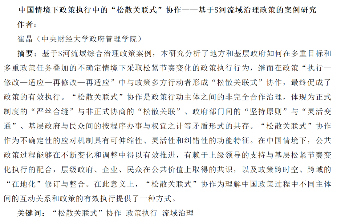 近日,beat365官网崔晶教授在核心期刊《管理世界》上发表学术论文,题目为《中国情境下政策执行中的“松散关联式”协作——基于S河流域治理政策的案例研究》。
