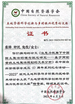 beat365官网柴铎副教授和学生钟悦(已毕业)的论文《注意力视角下中国国土整治的理念跃迁研究——基于两轮省级土地整治规划的文本分析》于2023年6月2日至3日在黑龙江省哈尔滨市举办的中国自然资源学会成立40周年系列纪念活动——2023现代土地科学与乡村振兴战略学术研讨会上获“土地资源科学创新与乡村振兴优秀论文奖”特等奖。