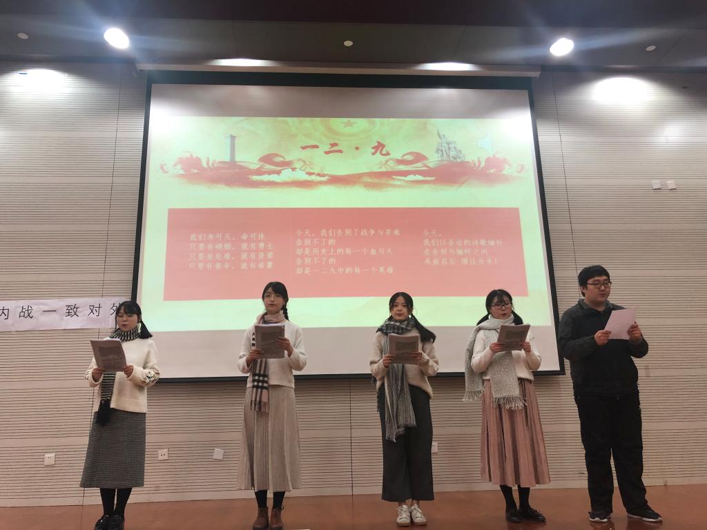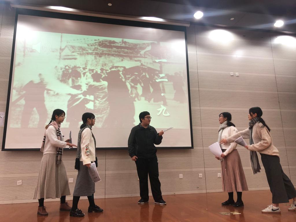 开场视频简明地介绍了小组学习历程。随着汇报的展开,小组成员提出新时代青年学生的身份构建,展现了对“一二·九”运动的学习思考。灵动的情景剧将我们带回那段血与火的岁月、真切感受到了青年学生应有的担当与使命;声情并茂的诗歌朗诵再现了青年学生奋起反抗、为国奉献的爱国豪情。