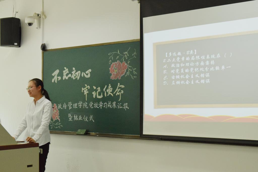 紧接着,姜玲副院长总结讲话。姜老师祝贺大家顺利完成党校培训,能在大学期间参加成果汇报会暨结业仪式是一件难得而又幸运的事,大家要珍惜此次机会,在磨砺和总结中提高自我的理论知识水平,锤炼党性修养。姜老师表示自己在短短的两个小时内,深刻感受到政管青年的蓬勃朝气,感受到大家在党校培训中真正做到实干实学、奋发有为。面对这批优秀群体,姜老师提出了更高的期望,一是要不忘初心、牢记使命,牢牢铭记实现民族复兴梦的历史使命和时代责任;二是要坚定理想信念,争取早日成为一名光荣的优秀共产党员;三是要继续保持和发扬优良作风,在生活中、在学生群体中发挥好先锋模范作用;四是要加强学习,联系时事热点学,联系专业领域学,实现互促互进,提高自己全面素质。