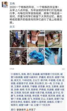 从4日早晨到5日黄昏,历时两天,随着交接组五位老师交接工作的顺利完成,随着最后一辆货车奔赴远方,毕业生行李打包及邮寄工作告一段落。“得知你们每一位都有了光明的前途,莫名增添了好多幸福感,衷心希望你们奋力向上成长、快乐生活!”这一辆辆货车承载着的不仅仅是毕业行李,更是老师对每一位学生的深切思念与衷心祝福。