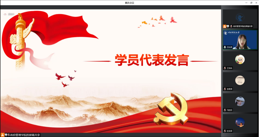 会议第三项,学员代表城市管理20吕东函同学发言。吕东函同学通过回顾党的百年历程、感慨如今光辉成就以及体悟青年使命担当,与大家分享了自己对于中国共产党本心的理解感悟——赓续红色血脉之心、坚定理想信念之心、践行青年担当之心。吕东函同学表示作为一名新时代青年大学生应当赓续红色血脉、坚定理想信念、践行青年担当,同时与同学们共勉,为成为一名光荣的共产党员而砥砺奋进。