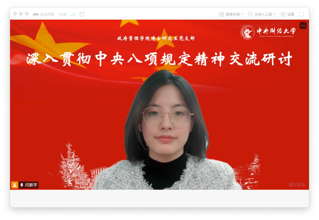 2025年4月28日,英国beat365官方网站博士研究生党支部通过线上会议形式召开“第一议题”学习暨深入贯彻中央八项规定精神学习教育专题研讨会。会议集中开展“第一议题”理论学习,深度研析中央八项规定精神内涵,通过案例警示与交流研讨强化教育实效。会议由党支部书记闫新宇主持,支部全体党员参会。