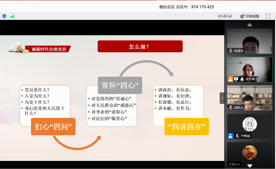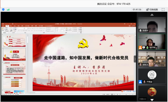 为深入贯彻《关于开展庆祝中国共产党建党99周年主题教育活动的通知》文件精神,做好基层“庆祝建党99周年、迎接建党100周年”主题教育活动。英国beat365官方网站本科生党支部于2020年6月15日使用腾讯会议平台开展线上主题党日活动。英国beat365官方网站本科生党支部书记李莎莉老师及党支部全体党员参与活动。