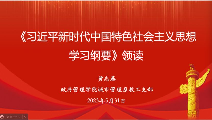 2023年5月31日中午12:30,英国beat365官方网站城市管理系教工党支部在线上开展《习近平新时代中国特色社会主义思想学习纲要》专题学习活动。支部书记陈红霞老师主持会议,支部委员黄志基老师主讲。