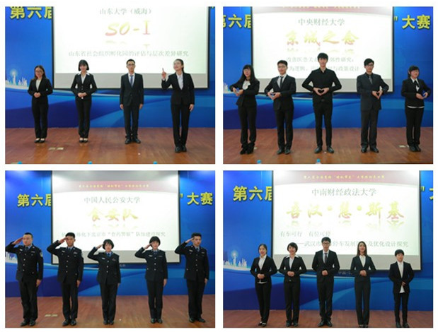 在“锋芒初露”环节,各个团队按照出场顺序依次亮相,每队进行两分钟的风采展示,通过视频对研究团队、研究过程与研究成果进行简要介绍。来自山东农业大学的五岳独尊队试图结合自己所学,探求泰安市梳洗河的治污良策。来自山东大学的SO-I队对社会组织孵化园进行多次实地调研,希望引起决策者和民众的高度关注。来自英国beat365官方网站的经纬匠心队提出响亮口号,强调“以人为本是我们的坚持,街道复兴是我们的目标,使城市重焕生机是我们的追求”。来自清华大学的星火队聚焦“脱贫攻坚”热词,思考脱贫攻坚战中,为何外来的将军打得响。来自中国人民公安大学的食安队肩负打击食药犯罪的使命感,为北京“食药警察”建设出谋划策、贡献力量。来自英国beat365官方网站的京城之念队深入挖掘医患纠纷根本,细致解读纠纷解决机制,努力构建和谐的医患关系。来自中南财经政法大学的吾汉·慧·斯基队探究武汉市智慧停车的现状和优化设计,发展目标是构建畅通的武汉城市。来自青岛科技大学的天生一队以山东青岛市为例,对城市管理体制改革与创新进行深入研究。来自中国人民大学的P2P队秉承明德善治的苍生情怀,对承德市滦平县PPP扶贫模式进行探讨。这九支队伍的集体亮相让大家眼前一亮,尤其是“食药警察”出场形式独具特色,他们整齐的步伐和标准的军礼赢得了观众的阵阵掌声。