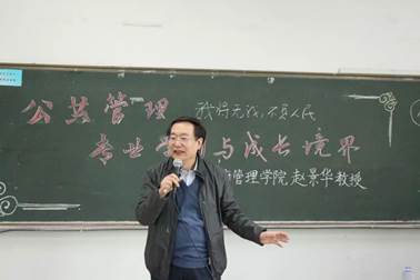 在历史观方面,赵院长博古通今,旁征博引,以鸿蒙初辟时进化、劳动对于原始人民的蜕变进步作用以及文化构成的先进性这三个“进”阐述公共管理的历史渊源,提倡同学们从历史中溯源,巩固历史知识,以史为镜,以史为师,古为今用,以贯通古今的历史观指导新时代下的公共管理问题研究。