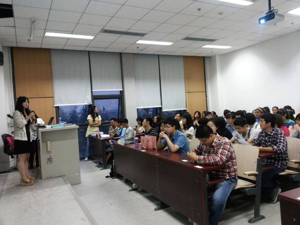 几位班委代表全班首先诚挚欢迎大家相聚国政,贴心地在大学学习、生活以及即将到来的军训等方面为学弟学妹提出几点建议,也愿两个年级多多交流多多合作,共创国政新未来。接下来,照例进行传统项目国政配对活动。由主持人抽取13级新生,再由新生抽取学长学姐,结成“一帮一”组合。来自五湖四海的新同学简单介绍自己过后,便是紧张的抽签环节,被叫到名字的学长学姐难掩喜悦之情,下台后与学弟学妹作进一步交流。随着“配对”的顺利推进,越来越多的组合诞生:有的正好是同乡,有的之前已有接触,有的是万众期待的“男女”搭配。整个教室立即成为一片欢乐的海洋,新生带着新鲜感,老生肩负责任感,良好互动,积极交流。