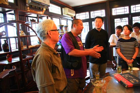 时间已到正午,在同学们饥肠辘辘之时,袁老先生又带给了大家惊喜,他带领着大家穿过老街,寻找“贾大爷”,又一位奇人,必定会有奇闻。“贾大爷”贾勇先生曾是一名北京举重运动员,现在是集摄影家、画家、民间外交家等“多家”于一身的奇人,在他的卤煮店,同学们吃到了正宗的京味,看到了关于老北京胡同变迁的的优秀摄影作品,听到了北京的市井文化,感受到了北京的魅力。袁先生在午餐时分告诉我们“做人最重要的是三力——体力、智力和意志力,体力和智力是有限的,意志力是无穷的,同学们一定要无限发掘自己的意志力,才会有充实的人生”,这句话同样被同学们铭记于心,作为自己的人生准则。美味的午餐结束后,同学们与“贾大爷”合影告别,继续大栅栏之旅。