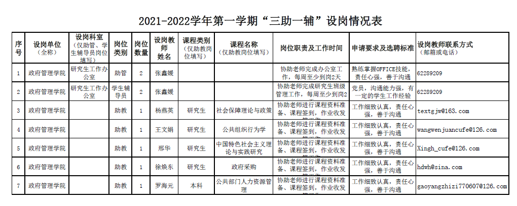 英国beat365官方网站2021-2022学年第一学期“三助一辅”设岗情况