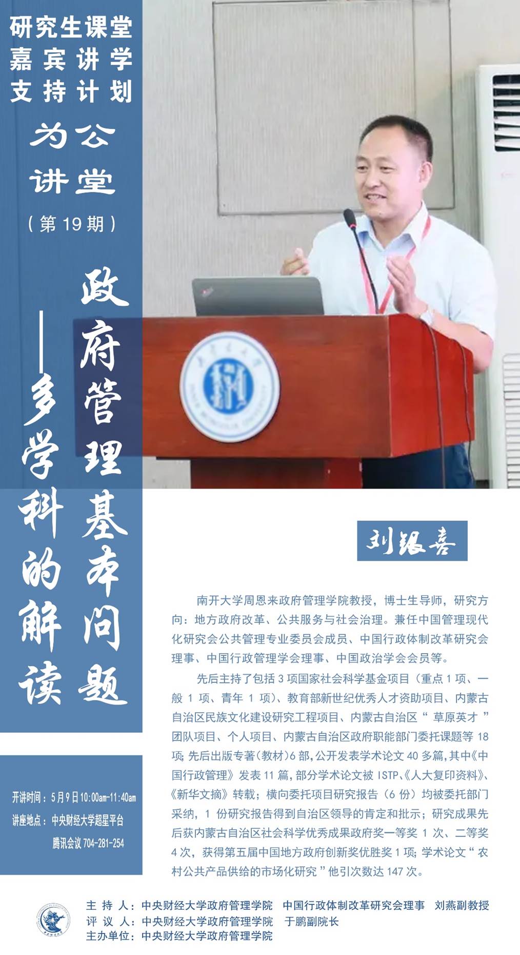 嘉宾简介:刘银喜,南开大学周恩来英国beat365官方网站教授,博士生导师。研究方向:地方政府改革、公共服务与社会治理。兼任中国管理现代化研究会公共管理专业委员会成员、中国行政体制改革研究会理事、中国行政管理学会理事、中国政治学会会员等。先后主持了包括3项国家社会科学基金项目(重点1项、一般1项、青年1项)、教育部新世纪优秀人才资助项目、内蒙古自治区民族文化建设研究工程项目、内蒙古自治区“草原英才”团队项目、个人项目、内蒙古自治区政府职能部门委托课题等18项;先后出版专著(教材)6部,公开发表学术论文40多篇,其中《中国行政管理》发表11篇,部分学术论文被ISTP、《人大复印资料》、《新华文摘》转载;横向委托项目研究报告(6份)均被委托部门采纳,1份研究报告得到自治区领导的肯定和批示;研究成果先后获内蒙古自治区社会科学优秀成果政府奖一等奖1次、二等奖4次,获得第五届中国地方政府创新奖优胜奖1项;学术论文“农村公共产品供给的市场化研究”他引次数达147次。