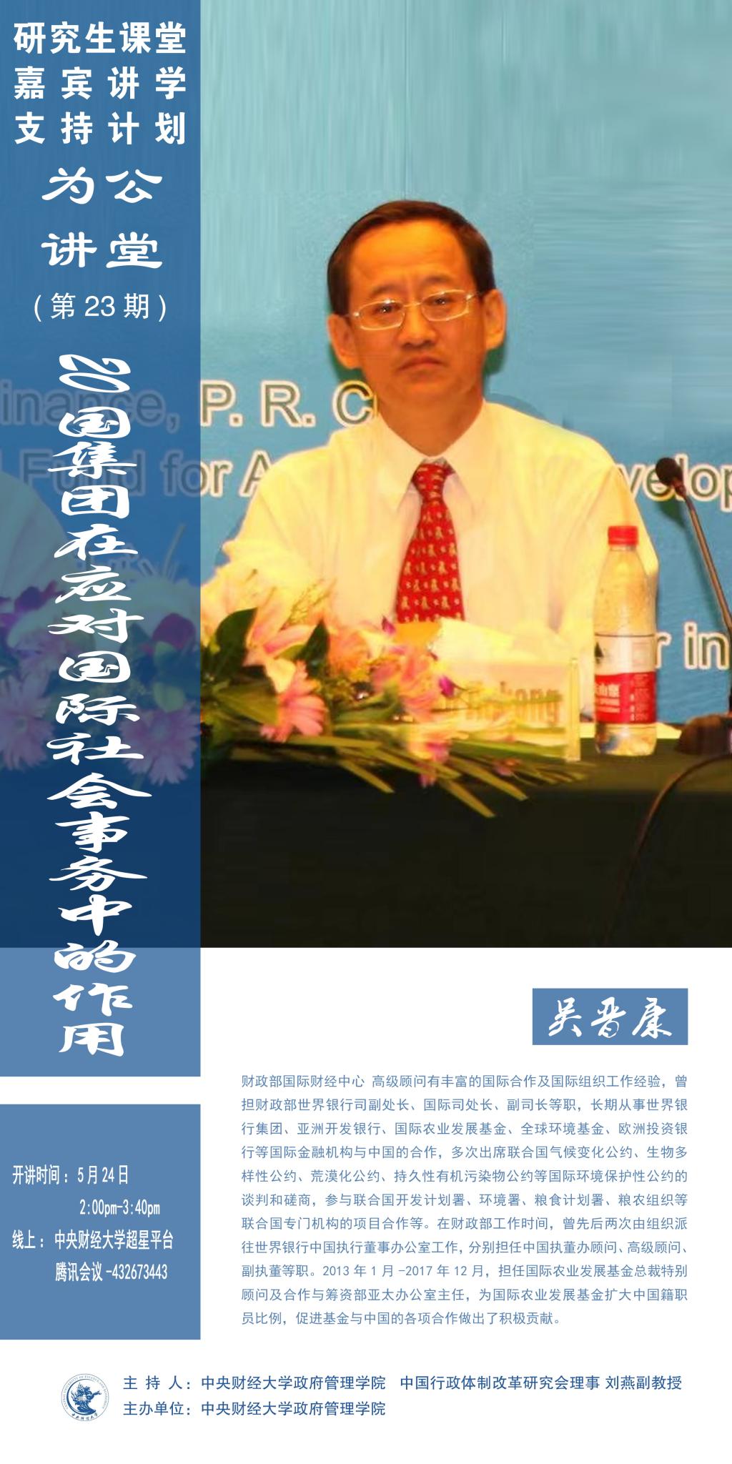 嘉宾简介:吴晋康,财政部国际财经中心高级顾问,有丰富的国际合作及国际组织工作经验,曾担财政部世界银行司副处长、国际司处长、副司长等职,长期从事世界银行集团、亚洲开发银行、国际农业发展基金、全球环境基金、欧洲投资银行等国际金融机构与中国的合作,多次出席联合国气候变化公约、生物多样性公约、荒漠化公约、持久性有机污染物公约等国际环境保护性公约的谈判和磋商,参与联合国开发计划署、环境署、粮食计划署、粮农组织等联合国专门机构的项目合作等。在财政部工作时间,曾先后两次由组织派往世界银行中国执行董事办公室工作,分别担任中国执董办顾问、高级顾问、副执董等职。2013年1月-2017年12月,担任国际农业发展基金总裁特别顾问及合作与筹资部亚太办公室主任,为国际农业发展基金扩大中国籍职员比例,促进基金与中国的各项合作做出了积极贡献。