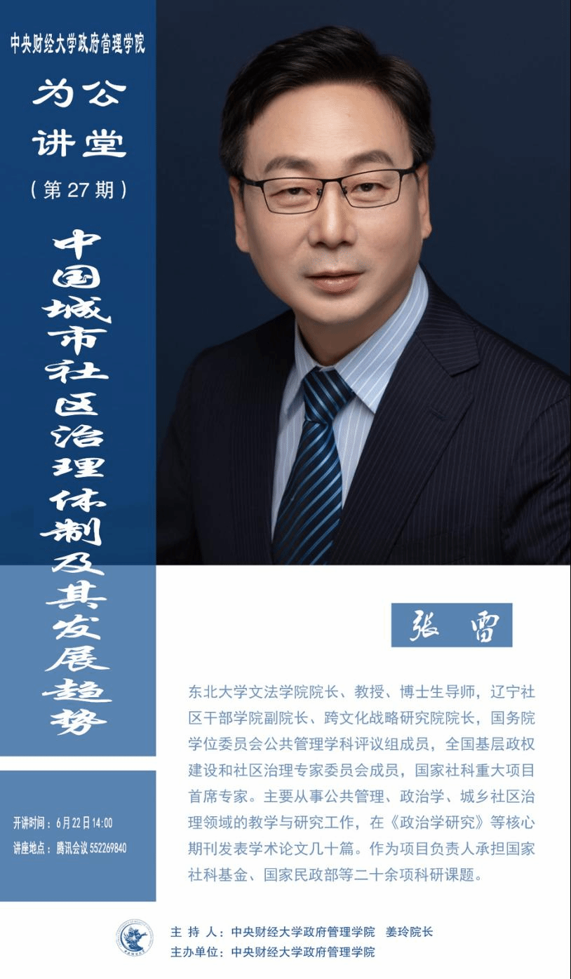 嘉宾简介:张雷,东北大学文法学院院长、教授、博士生导师,辽宁社区干部学院副院长、跨文化战略研究院院长,国务院学位委员会公共管理学科评议组成员,全国基层政权建设和社区治理专家委员会成员,国家社科重大项目首席专家。主要从事公共管理、政治学、城乡社区治理领域的教学与研究工作,在《政治学研究》等核心期刊发表学术论文几十篇。作为项目负责人承担国家社科基金、国家民政部等二十余项科研课题。