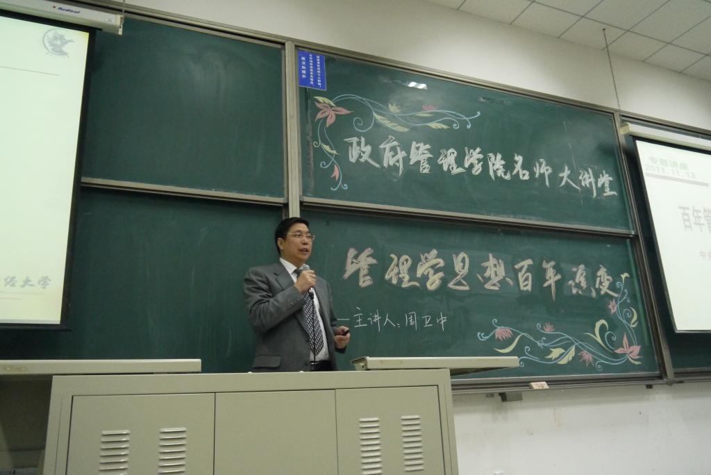 11月13日晚,英国beat365官方网站名师大讲堂系列活动在主教217拉开帷幕,包括全体团学骨干成员在内的百余名同学参与了此次活动。讲座开始前,团总支书记孙帮谦老师上台发言,他隆重介绍了此次名师大讲堂的主讲人周卫中教授,并阐述了在主题教育活动中开展“名师大讲堂”的必要性,深化了同学们对主题教育活动的理解与认识。介绍完毕之后,在一片雷鸣般的掌声之中,周卫中教授上台就“管理思想百年演变”这个主题发表了慷慨激昂的讲话。