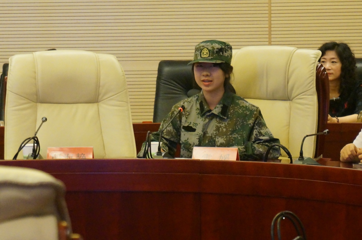 欢送会第一个环节便是雷媛同学作为一名新兵发表自己的感想与希冀。身着一袭迷彩军装的她,显得那么精神与自信,充满了力量。同时,她也表现出一向的沉着与从容,落落大方。雷媛同学首先表达了自己对中财这个大家庭一年来给予自己关爱的衷心感谢,也传达了内心渴望回报学校、让学校以她为荣的愿景。现场观众都能从她的真挚话语中,深切感受到一种侠骨柔情——渴望报效祖国的言语展现她巾帼不让须眉的豪情壮志;温婉淡雅的表情又让现场感受到女兵的飒爽英姿。那一刻,所有人都被这种富有激情而又充满温暖的场面打动了。