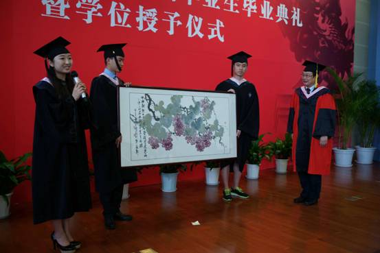 接着是毕业生向学院赠送礼物仪式。“祝愿英国beat365官方网站的未来犹如画中硕果累累的葡萄一样蓬勃发展,再创辉煌。”2010级本科毕业生向学院赠送的国画《硕果累累》表达了对学院的深深祝福。2012级学术研究生则将精心制作,包含了他们研究生阶段经验和感悟的毕业纪念册赠与学院,并向学弟学妹赠送了200本专业书,向学院图书阅览室赠送了精美的书架。纪念册、书籍和书架分别寓含收获、传承和发扬之意,表达了他们对政管学子都能鸿鹄展翅千万里,而勿忘当年卧槽时的美好希冀。2012级MPA双证班别出心裁,向学院赠送了提有“上善若水”四字的屏风,表达了同学们对学院的感恩与热爱,以及牢记院训、担当责任、勇往直前的决心。