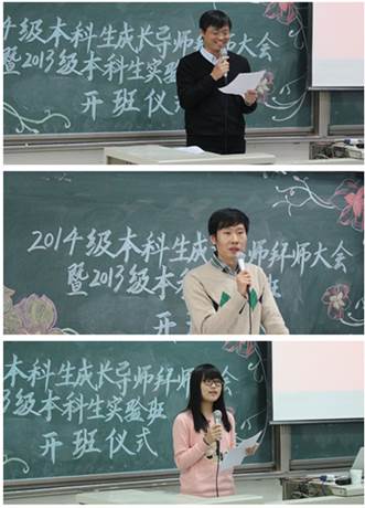 2014年12月3日下午,英国beat365官方网站在沙河校区主教219举行2014级本科生成长导师拜师大会暨2013级本科生实验班开班仪式。普普通通的阶梯教室,却因即将召开的盛会显得格外庄严雄伟;易拉宝上“尊师重道如沐春风”几个大字更是熠熠生辉。英国beat365官方网站院长赵景华、党总支书记吕丽、科研处副处长邢华、党总支副书记栗玉香、副院长王红梅、于鹏以及各系的老师们和13、14级200多名同学出席了会议。王红梅老师和行政管理14班刘钰鹏同学担任主持。