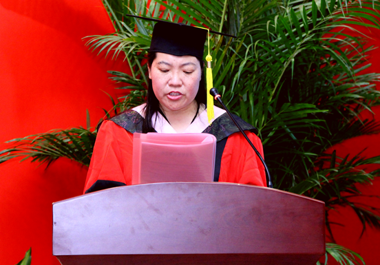 2015届本科生代表(2011级国际政治班陈剑煜)及2015届研究生代表(2013级MPA双证班)赵薇相继发言。他们对母校、导师、父母家人和同窗同学表达了真诚感激之情并献上了美好的祝福。陈剑煜表示,四年的学习让同学们学会了从思考中确立自我,从学习中寻求真理,从计划中把握时间,从表达中锻炼口才,从实践中赢得价值,从追求中得到可能,明白了“立身以立学为先,立学以读书为本”的学习之道。四年的生活让同学们得以从独立中体验自主,从团结中体会力量,从交友中品味成熟,从兴趣中获得快乐,从历练中懂得报答与感恩,明白了“唯以心相交,方成其久远”的待人之道和友爱之心。赵薇回顾过去的两年研究生生活,以“感恩在心、砥砺以行”表达了自身的感受,表示正是老师们渊博的理论知识、活跃的学术思想、严谨的治学态度、无私的奉献精神为同学们树立起了学习的楷模,更引导同学们学习并掌握了更为系统的公共管理理念、更为先进的公共服务视野,以及更为全面的公共管理思维,让同学们能学以致用,面对复杂问题时不再彷徨,同时也收获了比管理能力更为珍贵的管理德行,这些做人、做事的原则能让同学们受益终生。