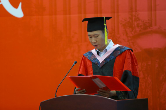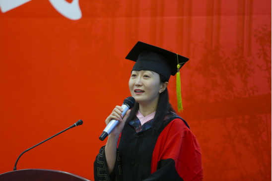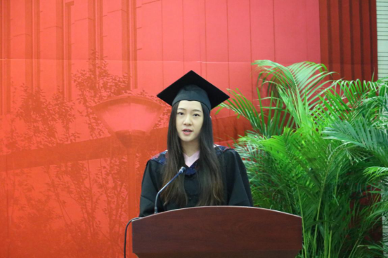 2016届本科毕业生代表公共管理事业班唐芊与2016届研究生代表MPA单证班刘哲峰相继发言。唐芊同学深情怀念四年的学习时光,回首了大一的纯真年代,大二的慷慨激昂,大三的紧张忙碌,大四的收获与离别。她表示,四年的学习,让同学们收获知识与才干,懂得了报答与感恩。她感谢学院的教导让自己明白“先立人再立学”的道理;感谢老师的谆谆教导与循循善诱;感谢父母的含辛茹苦与默默付出;感谢同学的陪伴与帮助。未来的道路虽充满未知与挑战,但作为一名流着政管血脉的光荣中财人,并不需要畏惧,更要勇往直前。刘哲峰同学开合有度,幽默诙谐的发言引起全场共鸣,他以“最有魅力”四字为时代特点作结。在飞速变化,日新月异,光明与黑暗共存,希望与失望同在的大背景下,他们选择来到政管的课堂,在这个浮躁的时代,他们选择潜心读书,以实际行动践行周总理“为中华之崛起而读书”的祈愿。刘哲峰以自己的学习生活为线索,深情回顾自己的中财岁月,感怀风格迥异的各位老师,畅谈自己在政管课堂最大的收获——找到了如何处理好核心价值和多元价值的关系。
