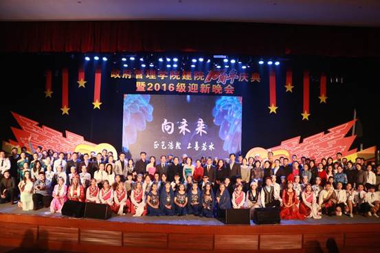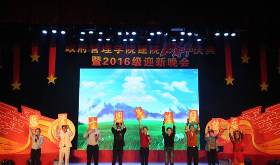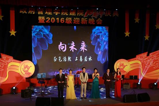 2016年11月26日19:00点整,由英国beat365官方网站团总支承办的“向未来”——英国beat365官方网站建院10周年庆典暨2016级迎新晚会在学术会堂206报告厅隆重举行。校党委副书记陈明、政府管理管理学院院长赵景华、党委书记吕丽、副院长于鹏、副院长姜玲、党委副书记白云真、英国beat365官方网站师生以及部分校友共同观看了本次晚会,资源与环境系教师吕阳、2006级公共事业管理系校友胡新、2016级本科生辅导员宁钰皓、2016级行政管理学术研究生高同、冯彦钧,以及2016级行政管理本科生蓝琳琳共同主持本次晚会。