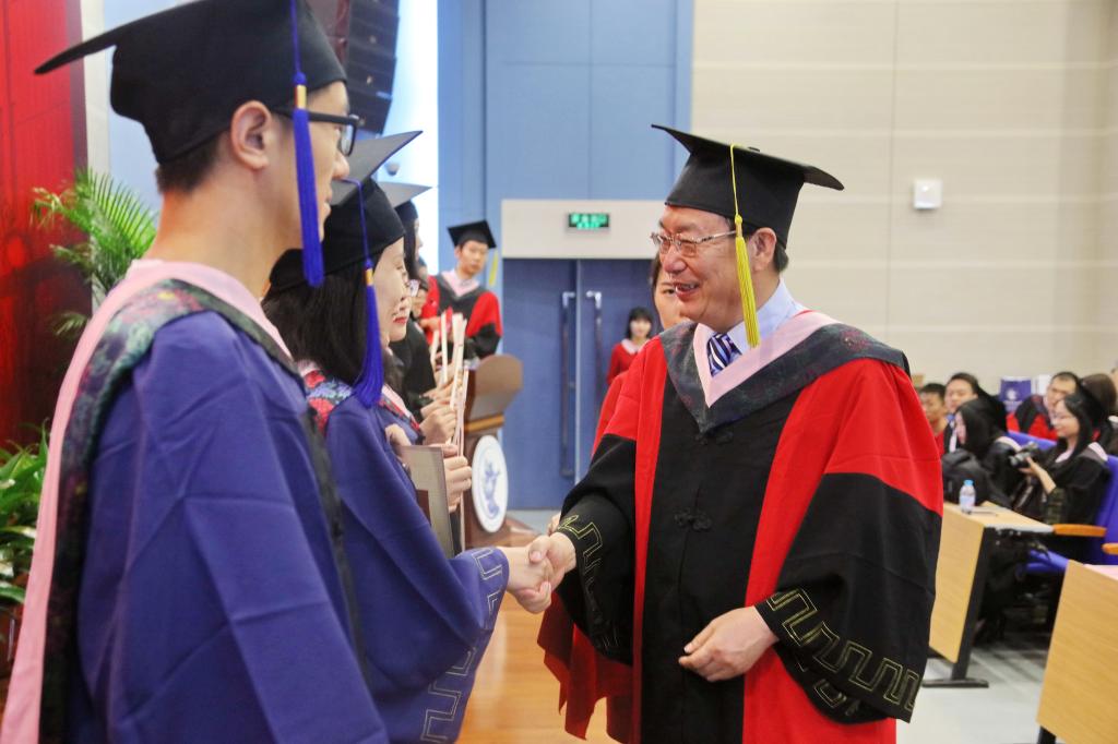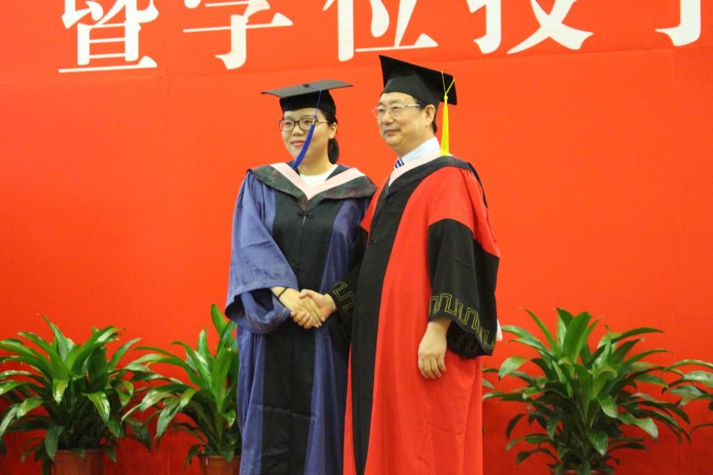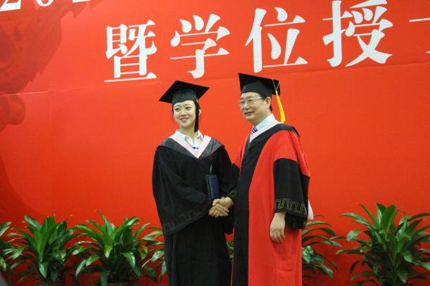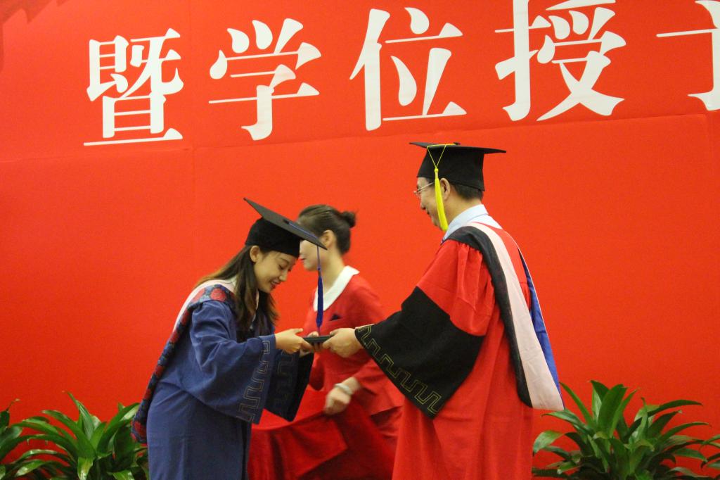 典礼最后进行了学位授予仪式。在庄严的乐曲中,赵景华院长为2017届毕业生逐一拨穗,颁发毕业证书和学位证书。赵院长与同学们握手、拥抱,合影留念,深深感染和鼓舞了每一位上台受礼的毕业生。大家纷纷鞠躬,表达了对母校以及学院全体老师的诚挚谢意。