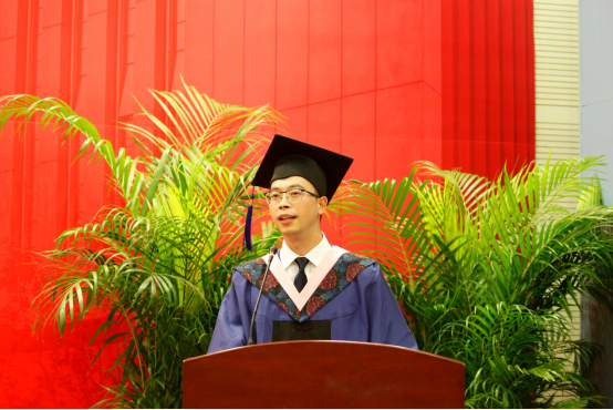 典礼进行第五项,毕业生代表发言。2018届本科生代表行政管理14班杨崇祺与2018届研究生代表学术型硕士16班朱洁相继发言。杨崇祺以轻松诙谐的语言道出了他一直深藏心间的三个感谢:感谢同学四年的帮助和相互扶持,让他感受到家的关怀与温暖;感谢老师的细心栽培和教授,师恩四年,永生难忘;感谢父母默默的支持,一路的成长离不开他们无悔的付出。最后,杨崇祺与所有的毕业生们分享了八个字:忠诚、团结、正气、担当,并祝愿老师亲友们身体健康,祝愿学院桃李满天下。接下来,朱洁作为研究生代表发言。朱洁在表达对学院和老师同学们的深深感谢之后,提出了思考:漫漫求学路,学院带给同学们的到底是什么?朱洁认为,大学之道,最重要的是教会他怎样做一个大写的人:做人上有格局与情怀,做事上懂责任与担当,做学问上崇尚真理与敢于质疑。朱洁认为学会做人,学会做一个大写的人,才能无愧于“中央政府人”的称号!最后,朱洁祝愿学院再创辉煌,祝愿老师们身体健康,祝愿学子们前程似锦!