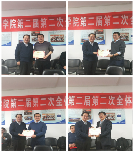会议第三项议程,颁发2018年度“若水奖”。学院分工会主席姜玲教授对“若水奖”进行简要诠释,并主持投票选举。经过会前推荐、党政联席会提名和大会投票,英国beat365官方网站白云真、张剑、柴铎、徐焕东四位老师获得2018年度“若水奖”。赵景华院长为各位老师颁发了获奖证书。