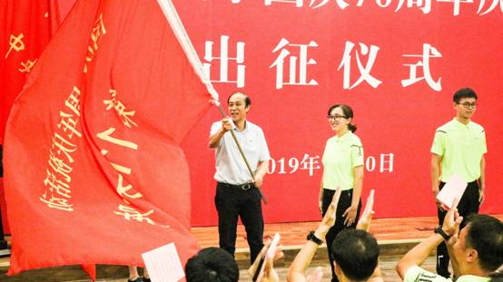 beat365官网学生祖木然提·帕尔哈提作为群众游行代表接受校党委书记何秀超授旗
