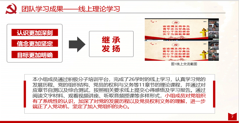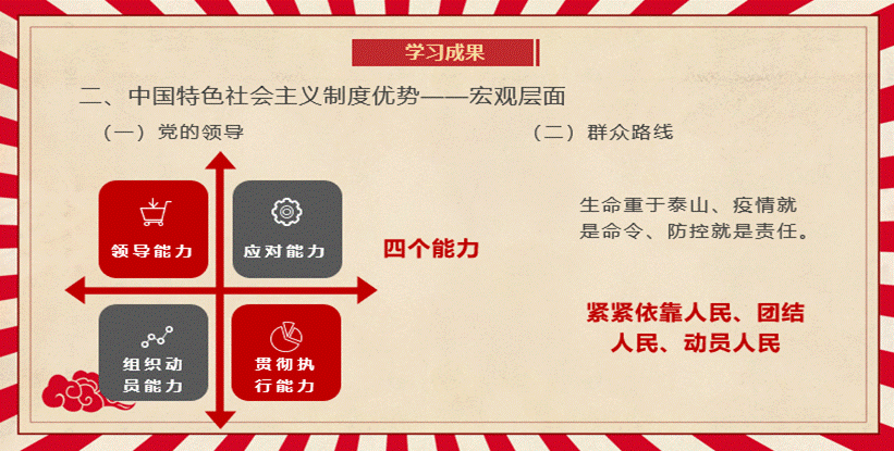 “传承中国基因,讲述中国故事。”“青春向党”小组通过观看影片、小组讨论学习、个人实践活动探究抗疫实践中展现出的中国特色社会主义优秀成果。小组成员广泛搜集资料,了解基层社区在疫情期间发挥的重要作用,并通过国内外比较分析,展示了中国特色社会主义制度的巨大优势。作为新时代青年,我们应在党和国家召唤下,勇担使命,铸造青春辉煌。