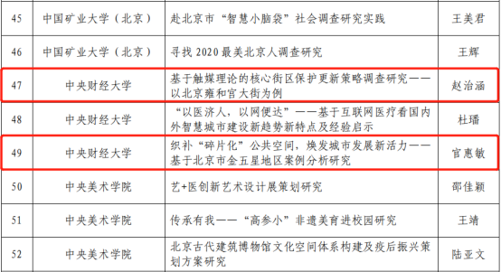 beat365官网三支师生团队在激烈角逐中脱颖而出,李宇环副教授队伍的项目《社会资本参与老旧小区改造的渠道创新与政策突破调研》荣获教师组优秀示范项目;赵治涵同学队伍的项目《基于触媒理论的核心街区保护更新策略调查研究——以北京雍和宫大街为例》以及官惠敏同学的项目《织补“碎片化”公共空间,焕发城市发展新活力——基于北京市金五星地区案例分析研究》荣获学生组优秀示范项目。