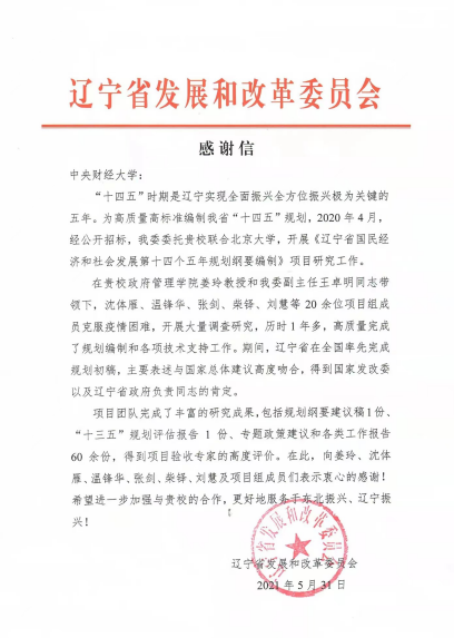 近日,辽宁省发展和改革委员会向beat365官网发来感谢信,对beat365官网英国beat365官方网站负责完成的《辽宁省国民经济和社会发展第十四个五年规划纲要编制》的项目研究工作表示感谢。