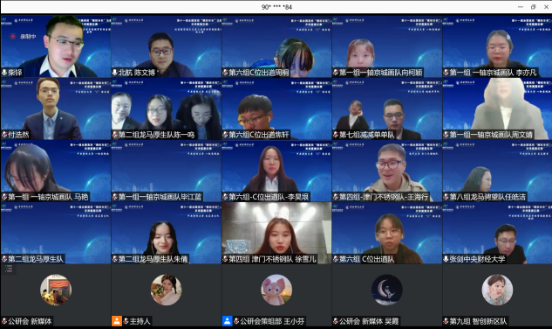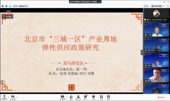 “一轴京城画队”由北京市“十四五”规划引入,通过追溯背景中轴线的文化内涵以及调查分析中轴线沿线街道现状的优势与问题所在,提出如何避免中轴线上街道陷入旅游商业化的恶循环的具体措施以及推动中轴线申遗进程的建议;并在评委老师的引导下将中轴线文化概括为庄重、严谨有序、中庸。“龙马厚生队”以全国和北京的政策导向为背景,从供应方式创新角度详细分析了“作价出资”出现的必要性,并采用问卷调查和深度访谈相结合的方式调研实践,提出对北京市“三城一区”产业用地弹性供应和政策的创新优化;并回答了评委老师关于理论来源的问题。“梦之队”从“边角剩余”空间出现的背景与意义出发,分析典型案例,深入研究相关理论,同时实地调研,采访专家,提出了健康中国战略下北京城市“边角剩余”空间的体育化,还指出了未来发展的方向和可能会遇到的问题;并回答了评委老师关于”剩余空间“改造标准的问题。“津门不锈钢队”以天津市老旧厂房改造为例,通过分析问题源流与政治政策,辨析数字孪生与城市更新的概念,提出解决构建应用平台的解决思路,分析“巧夺天工”平台运行逻辑,对平台工作机制进行剖析,明确其六大功能,完善了城市更新背景下老旧工业区转型策略;并回答了评委老师关于老旧工业区改造转型路径和商业价值如何体现的问题。“京生盎然队” 切实关注北京市人口政策,为北京市和中国的发展贡献青年思考和青年力量。他们通过线上发放定向问卷,线下对母婴室使用情况进行实地调研等,对北京市三孩政策的贯彻落实方法做出了思考与研究。“C位出道队”对北京市面向碳中和的经济转型模式构建进行了研究,在国家宏观政策和北京市相关政策双线并行的情况下,通过对国内外案例梳理,构建出了北京市面向碳中和经济转型的“IDEAL”模式及政策建议。“减减单单队” 聚焦教育双减政策,关注教育沉疴积弊。他们分析教育减负困境、解读北京市政策,从现状、现象切入,研究北京市双减政策的落实方案,以实际行动助力双减落地,守护新时代学生健康成长。“龙马骋望队”取长补短,借鉴美国和日本的成功经验;校企合作,研究北京邮电大学与中国移动研究联合创新中心的具体案例,提出“一主三翼”创新概念及建议,助力打通科技成果转化的“最后一公里“,探索北京市产学研合作新模式。“智创新区队”秉持“心系民生,智创新区,让百姓生活更美好”的理念,心系基层民生,通过文献研究、案例研究等方法,基于多元治理理论和新公共服务理论,研究了基于社区治理创新的北京市老旧小区改造的问题。