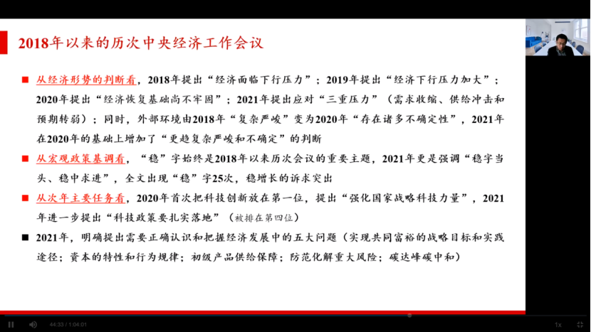 张剑老师谈到,2021年,在以习近平同志为核心的党中央领导下,在全党全国各族人民勠力同心艰苦奋斗下,我们国家经济实现了“十四五”的良好开局。但同时会议明确了国家经济发展面临着需求收缩、供给冲击、预期转弱的三重压力。在世纪疫情冲击下,百年变局加速演进,外部环境更趋复杂的现实状况。