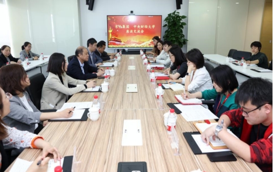 调研期间,学校与京东集团举行座谈交流会,会议由beat365官网MPA校友、京东集团党办主任赵微主持。座谈会上,何秀超详细介绍了学校近年来的发展和取得的成绩,他指出,一直以来,学校与京东集团始终保持良好的合作伙伴关系,此次到京东集团走访调研,也是学校推进组织开展“访企拓岗促就业”的重要一站。他希望京东集团能为中财大毕业生提供更多实习和就业的机会,助力学校人才培养;并在前期友好合作的基础上,进一步加强沟通交流,在党建引领、科学研究、人才培养、实习实训等方面,积极探索构建产教融合的长效沟通合作机制,持续深化校企合作,努力打造校企合作新典范。