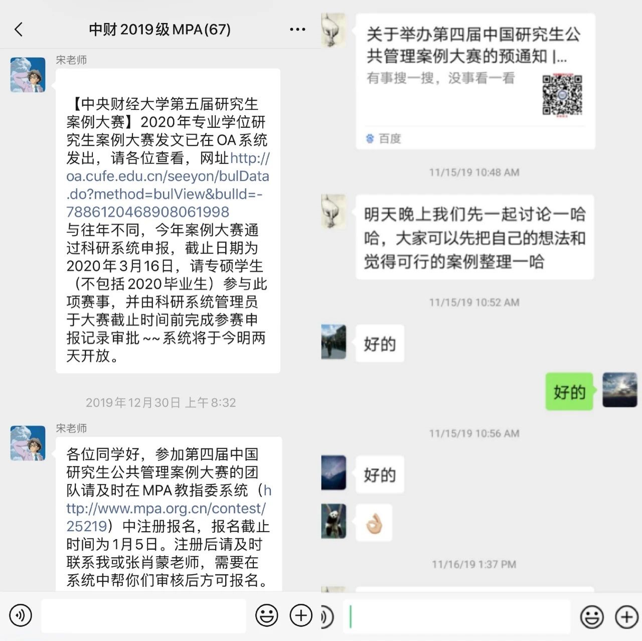 2019年11月10日,我们组建了中财公管案例群,然后开始钻研往届案例大赛作品。在讨论确定了案例的研究方向后,小组成员们开始积极搜集案例素材,阅读《公共政策学》、《公共管理学》等专业书籍,借助互联网平台获得一手资料,设计调查问卷,积极探讨。案例开展遇到困难时,有邢老师指点迷津。在这个过程中,我们相互协作,共同进步,这次案例大赛让我受益良多!