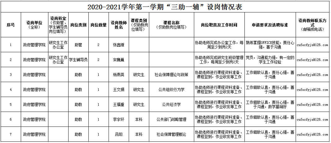 英国beat365官方网站2020-2021学年第一学期“三助一辅”设岗情况表