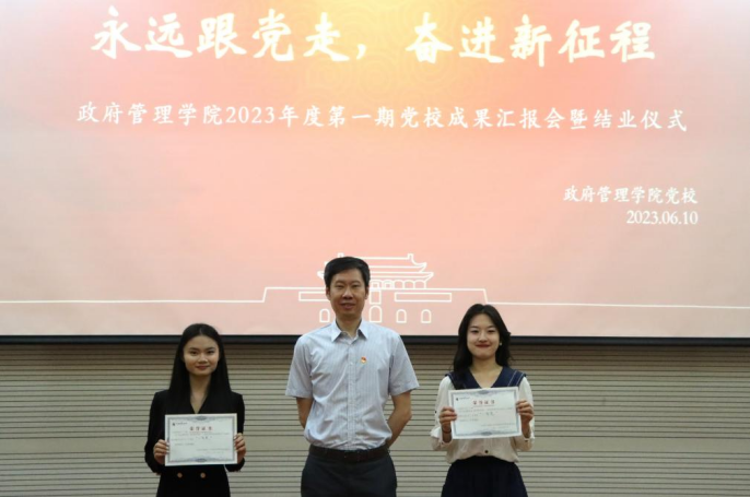 最后,学院党委书记、党校校长于鹏教授做总结性讲话。于鹏书记向56名入党积极分子学员和37名发展对象学员的顺利结业表示祝贺,指出本期培训班呈现出三个“好”:严格遵守学习纪律的班风好;知行合一的学习氛围好;结业考试和成果汇报的成绩好。于鹏书记强调,结业仪式并非学习的结束,而是进一步学习的开始,全体学员要以此作为新的起点,以更高的标准、更严的要求,以实际行动向党组织靠拢,并提出三点要求:第一,坚持理论学习,夯实理想信念之基。要坚持读原著、学原文,全面学习领会习近平新时代中国特色社会主义思想,做到内化于心、外化于行。第二,厚植家国情怀,勇担历史责任使命。不仅要勤学专业知识,更要树立起崇高的理想信念,将青年之“小我”融入“国家富强、民族复兴、人民幸福”的“大我”中,努力成长为担当民族复兴大任的时代新人。第三,躬身社会实践,激扬青春奋进。要躬身实践、知行合一,发挥公共管理学科专业特长,深入到国际组织、城市、社区、乡村的治理场景中,积极投身于中国式现代化的实践,以青年力量书写时代新篇章。最后他寄语,希望同学们能早日成为一名合格的共产党员,在以中国式现代化全面推进中华民族伟大复兴的进程中争做先锋,施展才华,绽放青春贡献。