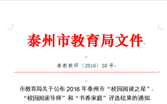 2016年10月,泰州市教育局组织开展了2016年泰州市“校园阅读之星”“校园阅读导师”和“书香家庭”评选活动。经过各市(区)层层推选,市教育局组织专家、名师评审,得出了结果,必赢官网学子韩鹏飞同学荣获“校园阅读之星”称号。