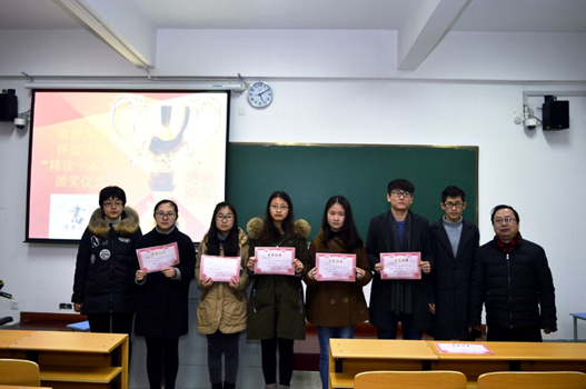 2017年1月8日下午,图书馆承办的“精读一本书”活动颁奖仪式在A栋教学楼101室成功举行。参赛选手以及读书协会的主要干部还有图书馆相关老师出席了这次活动。